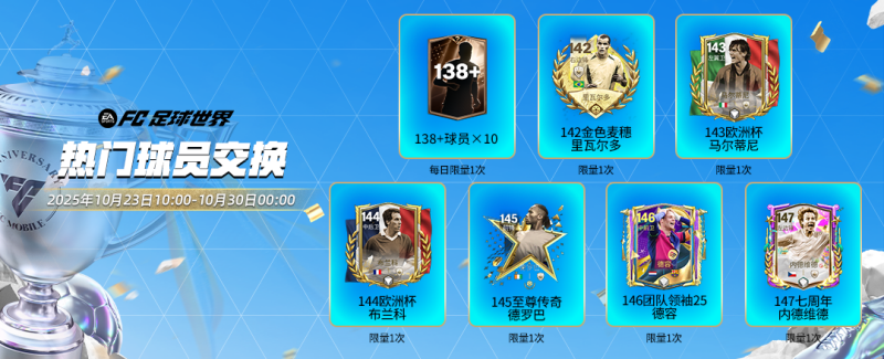 本周更新后,球员交换部分我们将迎来138+球员x10混合交换,以及142金色麦穗里瓦尔多、143欧洲杯马尔蒂尼、144欧洲杯布兰科、145至尊传奇德罗巴、146团队领袖25德容、147七周年内德维德,六项定向交换在内的,共计七项交换项目。